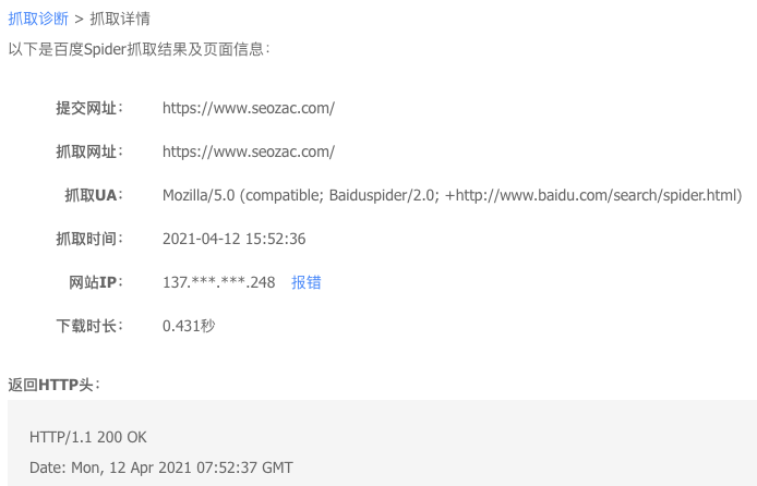 可以看到,資源平臺在抓取詳情中顯示了百度解析的IP地址,SEO可以清楚地知道百度是否開始抓取新IP。如果更改域名服務器3天后百度還是解析到舊IP,就要仔細檢查域名服務器的設置了。